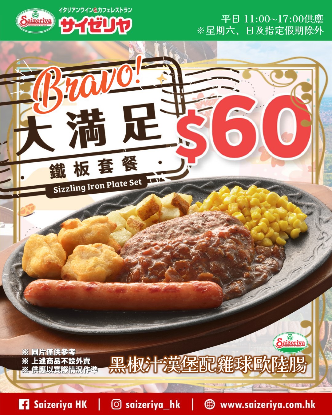 外賣自取外賣自取現已全線登場,預先自助落單。更方便・更快捷 如有任何爭議,本公司保留最終決定權 | 系統不支援微信/支付寶/八達通程式的二維碼掃描器。請使用手機內置或其他掃描器下單 一切以分店實際情況作準 | 成功付款後,訂單的預計完成時間約為30分鐘,實際時間請向店員查詢 ⇩點擊下圖,立即下單⇩ 餐牌食物供應視乎個別分店而異,以分店實際情況作準。詳情請向分店店員查詢 推廣 堂食 外賣 午市套餐 冷凍食材 最新消息 【Lunch Menu更新】Bravo大満足鐵板套餐・自由選超值套餐 (更新版2月2日起全線登場)02/02/2026 【新鮮燈腸】燈籠腸(意式肉腸)沙律 (分店限定・現正供應)24/12/2025 【壓軸燈腸】白汁燈籠腸(意式肉腸)薄餅 (分店限定・現正供應)23/12/2025 更多招聘站