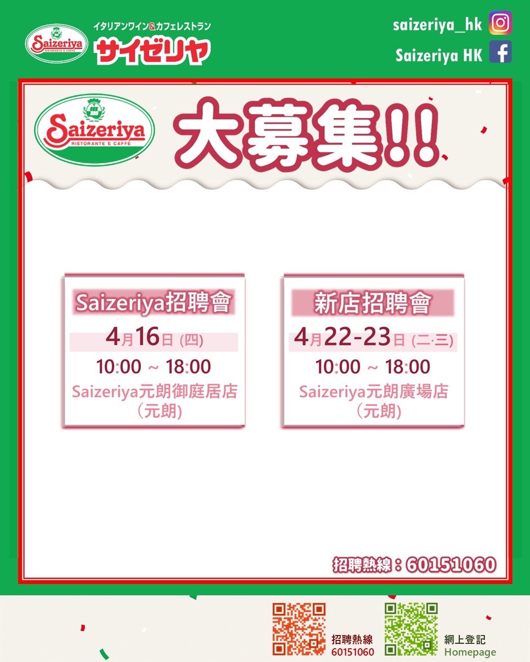 【人才招募】Saizeriya元朗招聘會(4月16日) 為擴張到200間分店做好準備🙋🏻♀️🙋🏻🙋🏻♂️! 不論經驗多與少,只要你有熱誠都歡迎加入我們😊 📣歡迎有意者蒞臨應徵📣 【Saizeriya元朗招聘會】 🗓️ 日期︰2026年4月16日 (星期四) 🕙 時間︰上午10:00 ~ 下午6:00 🏠 地點︰Saizeriya元朗御庭居店 📍 地址︰元朗馬田路80號御庭居地下及閣樓8號舖 🚃 輕鐵 豐年路站 (步行8分鐘) 📞 人事部 6015 1060 (Whatsapp) ※所有資料將會絕對保密,並只用作考慮本集團 / 本公司 有關或類似職位之申請。 【人才招募】新店招聘會(元朗廣場店)(4月21至22日)14/04/2026 【新店】長沙灣映築店(現已開業)26/03/2026 【新店預告】長沙灣映築店(3月尾見)19/03/2026 【春季限定】米蘭風味・意式豬肉燉菜 (全線分店・現正供應)16/03/2026 【新春期間】全店照常營業10/02/2026 【Lunch Menu更新】Bravo大満足鐵板套餐・自由選超值套餐 (更新版2月2日起全線登場)02/02/2026