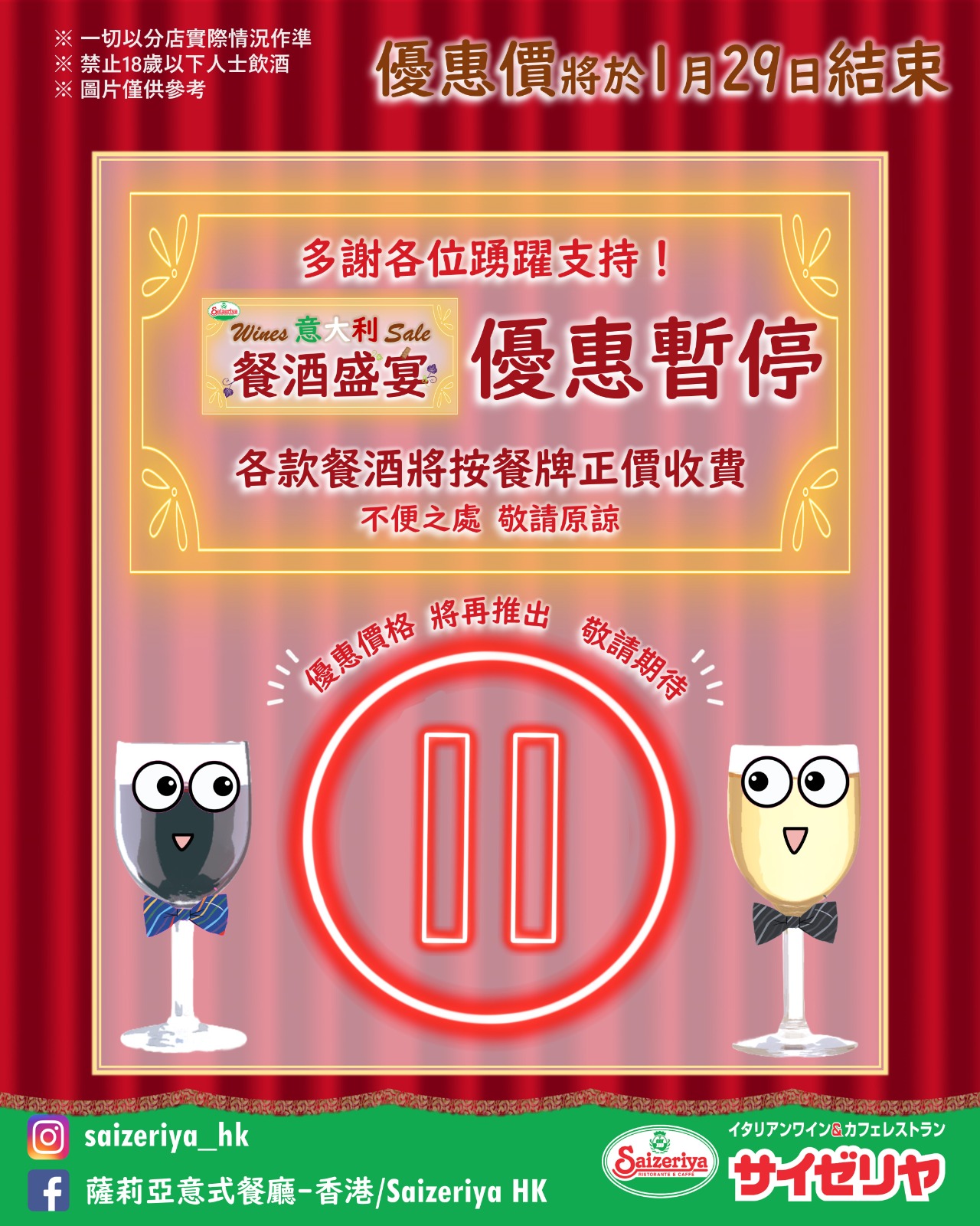 【意大利餐酒盛宴 ・優惠暫停】(1月30日起優惠暫停) 感謝各位踴躍支持😍💕! 今天(1月29日),將是「🇮🇹🍷意大利餐酒盛宴」特別優惠的最後一天…