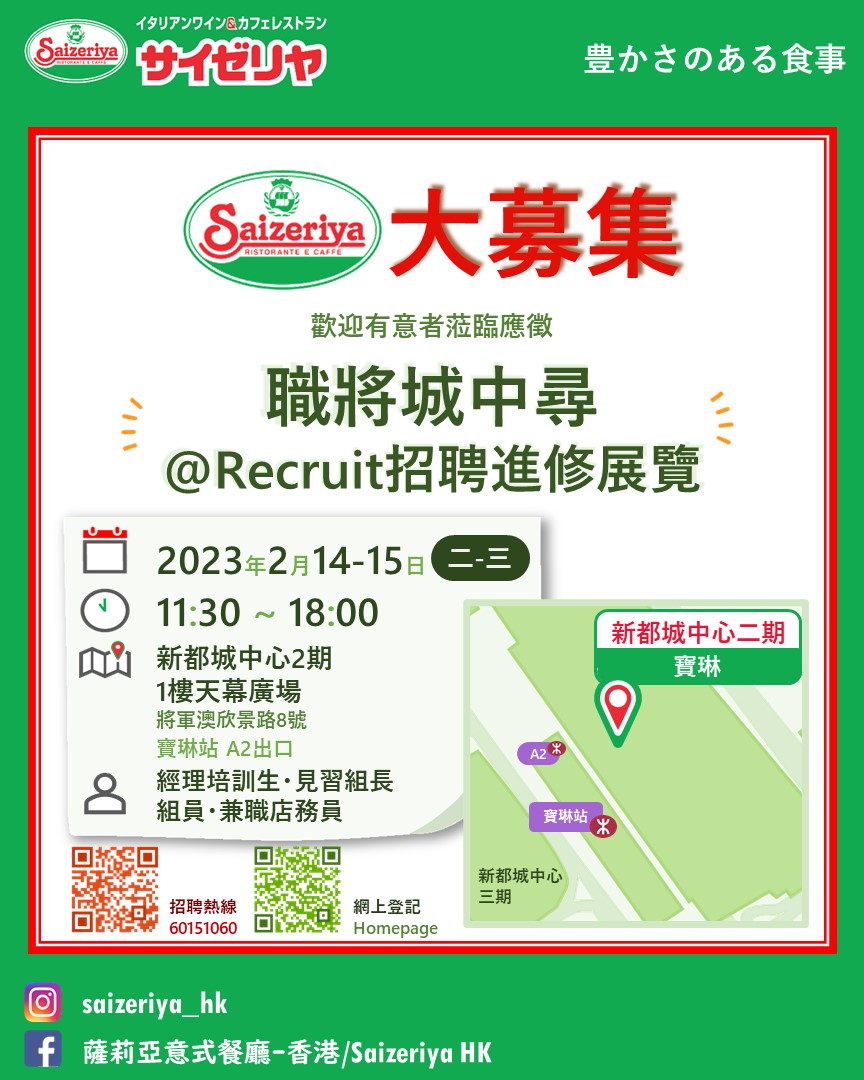 【人才招募】職將城中尋@Recruit招聘進修展覽(2月14-15日) 為擴張到200間分店做好準備🙋🏻♀️🙋🏻🙋🏻♂️!…
