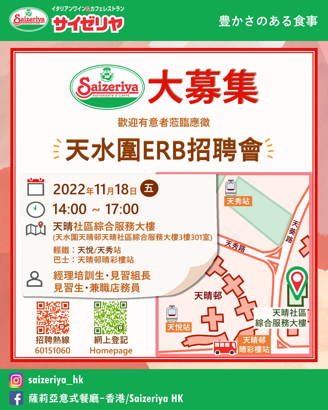 【人才招募】天水圍ERB 招聘會(11月18日 14:00-17:00) 為擴張到200間分店做好準備🙋🏻♀️🙋🏻🙋🏻♂️!…