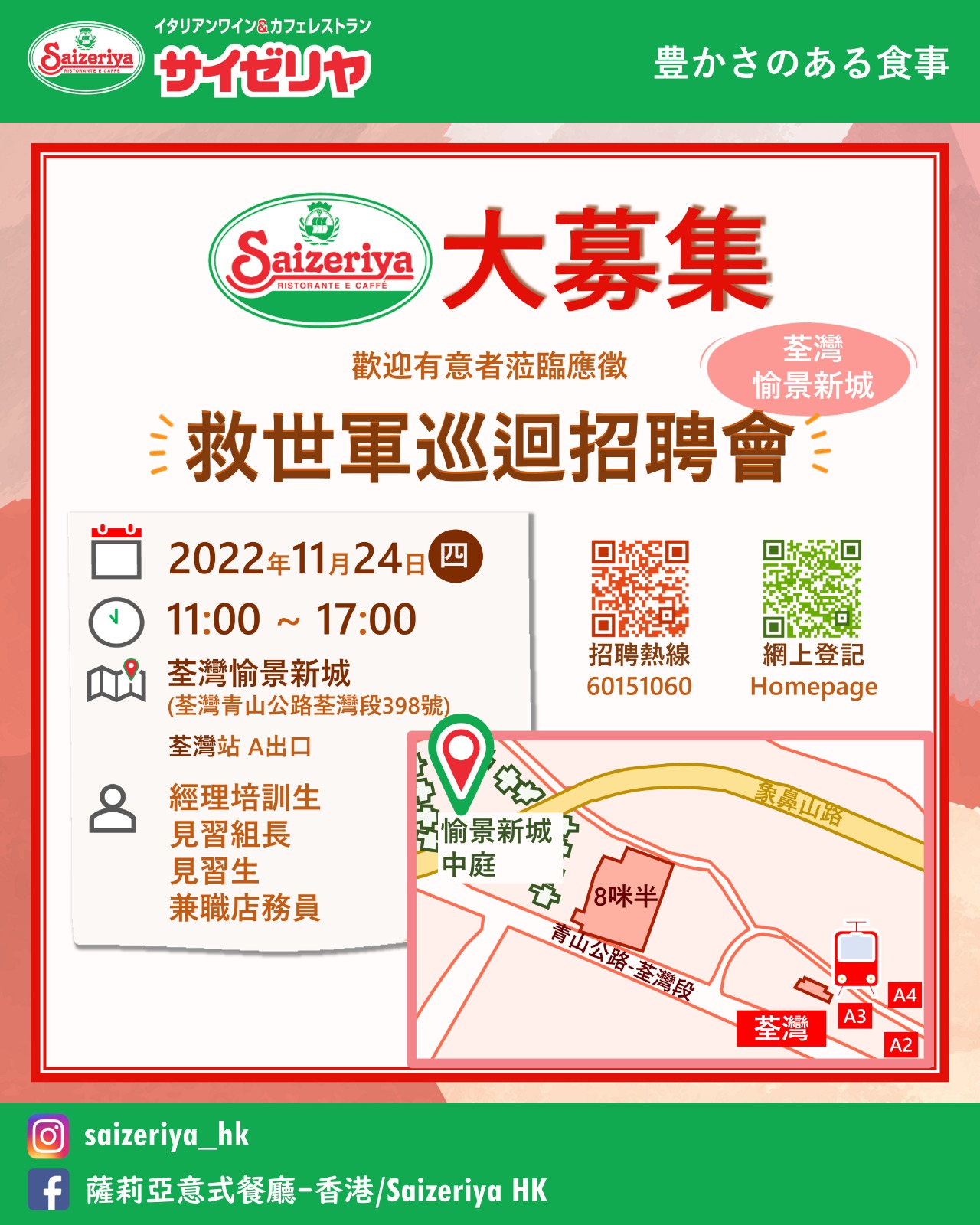 【人才招募】救世軍巡迴場招聘會@愉景新城(11月24日 11:00-17:00) 為擴張到200間分店做好準備🙋🏻♀️🙋🏻🙋🏻♂️!…