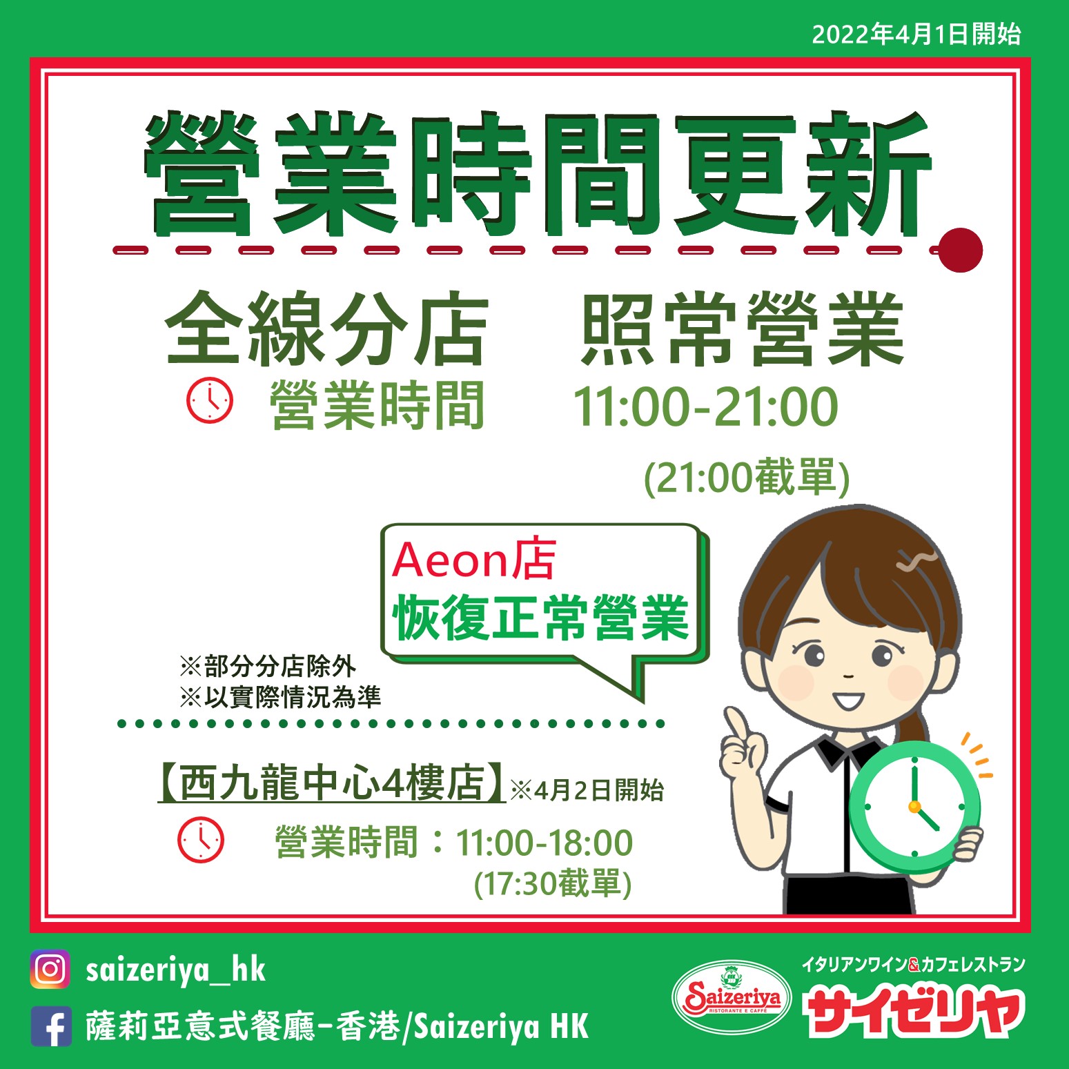 【特別營業安排】部份分店暫停營業1天(4月11日至4月14日期間) 🥰感激您一直以來的支持 👷🏻♀️👷🏻為配合內部工程 📣下週會有以下的特別營業安排…
