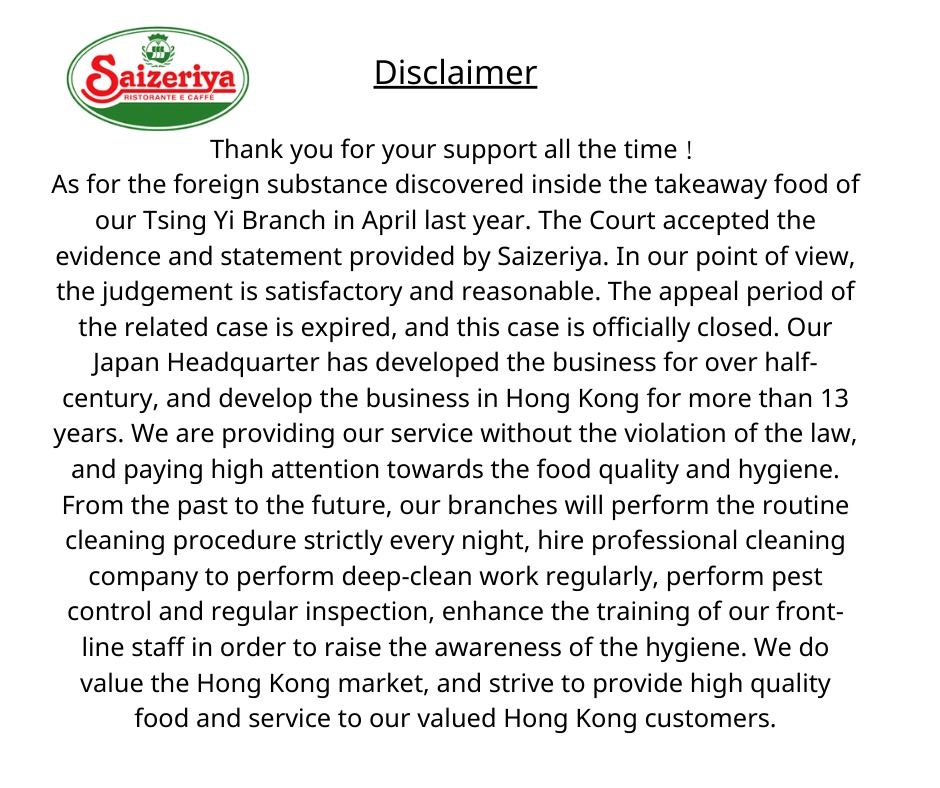 Disclaimer – Tsing Yi Branch (Cheung Fat Plaza)