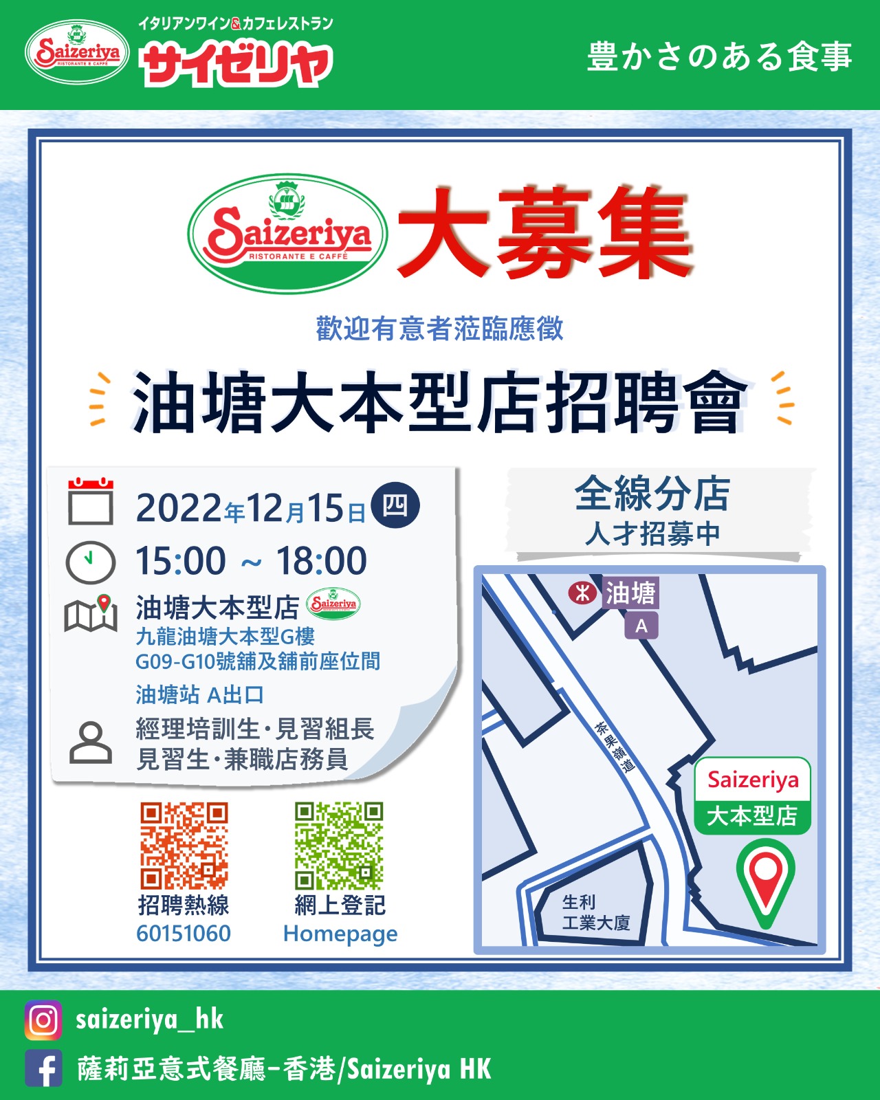 【人才招募】油塘大本型店招聘會(12月15日) 為擴張到200間分店做好準備🙋🏻‍♀️🙋🏻🙋🏻‍♂️! 不論經驗多與少,只要你有熱誠都歡迎加入我們😊…