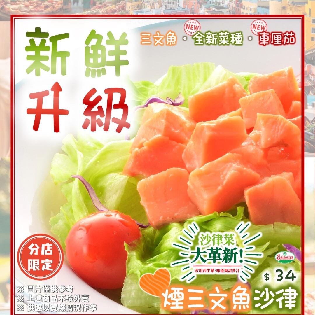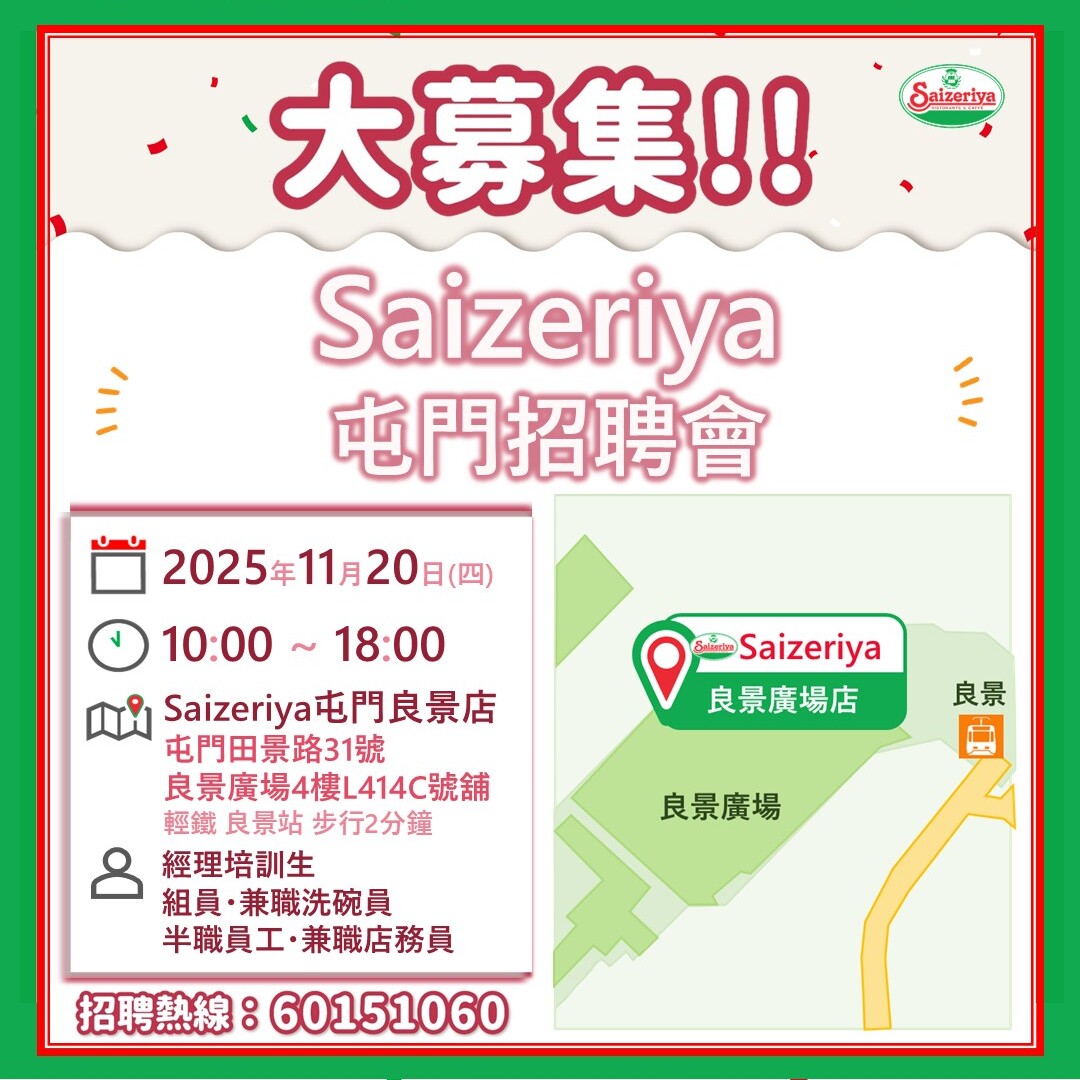 【人才招募】新店招聘會(屯門珀御坊店)(11月25至26日)18/11/2025更多 【人才招募】Saizeriya屯門招聘會(11月20日)13/11/2025更多 【新鮮升級】沙律菜大革新-分店限定・現正供應09/11/2025更多 【辣香滿溢】辣蕃茄雜菜煙肉意粉 (分店限定・現正供應)08/11/2025更多 【辣莎樂美】辣莎樂美腸薄餅 (分店限定・現正供應)07/11/2025更多 【百搭芝味】香焗肉醬烤野菜 (分店限定・現正供應)06/11/2025更多