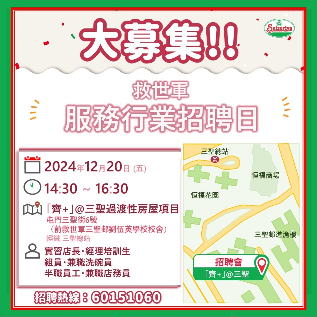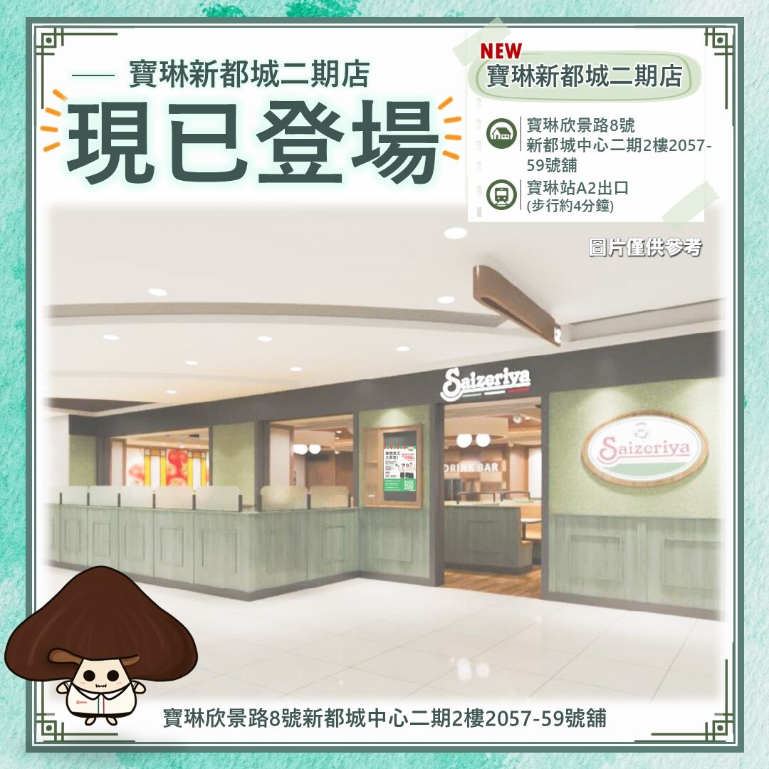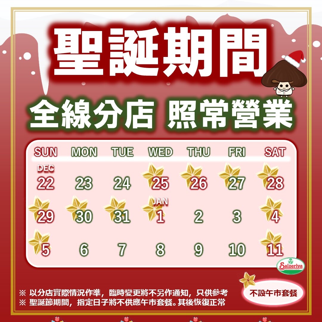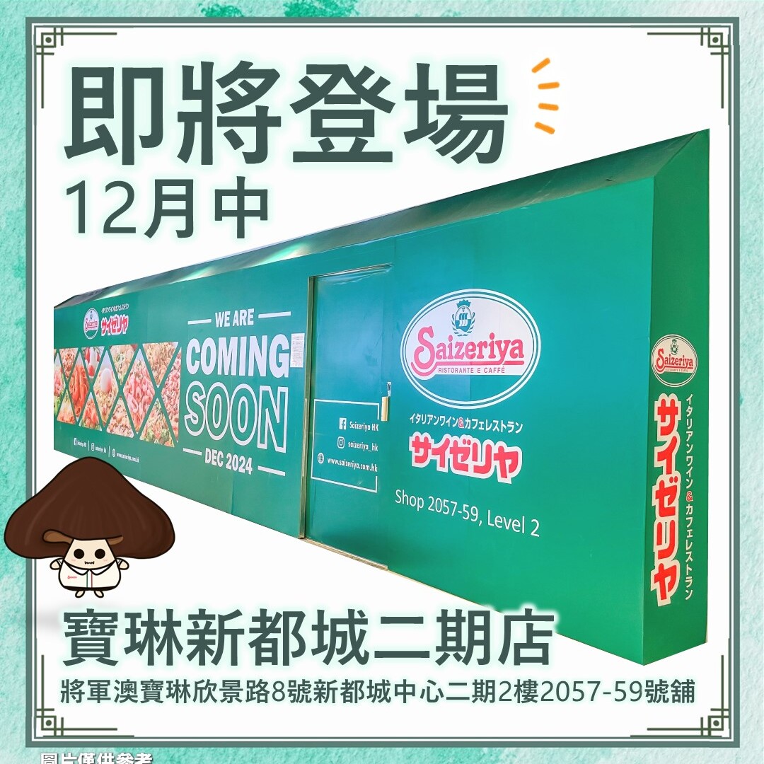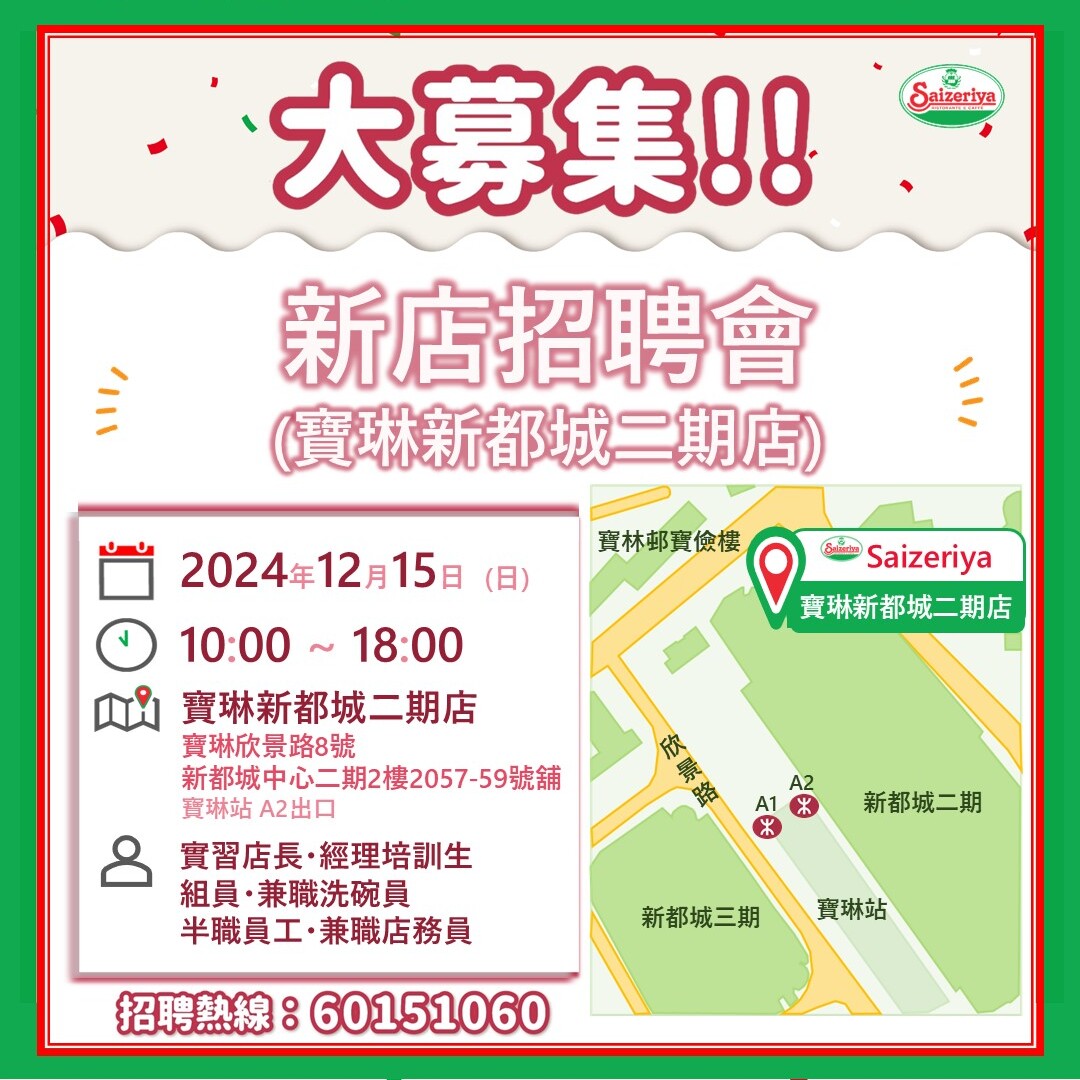 【聖誕期間】全店照常營業21/12/2024更多 【新店】寶琳新都城二期店(現已開業)16/12/2024更多 【新店路線教學】寶琳新都城二期店(數天後見)14/12/2024更多 【人才招募】救世軍服務行業招聘日(12月20日)13/12/2024更多 【新店預告】寶琳新都城二期店(12月中見)09/12/2024更多 【Saizeriya人才招募】新店招聘會(寶琳新都城二期店)(12月15日)08/12/2024更多