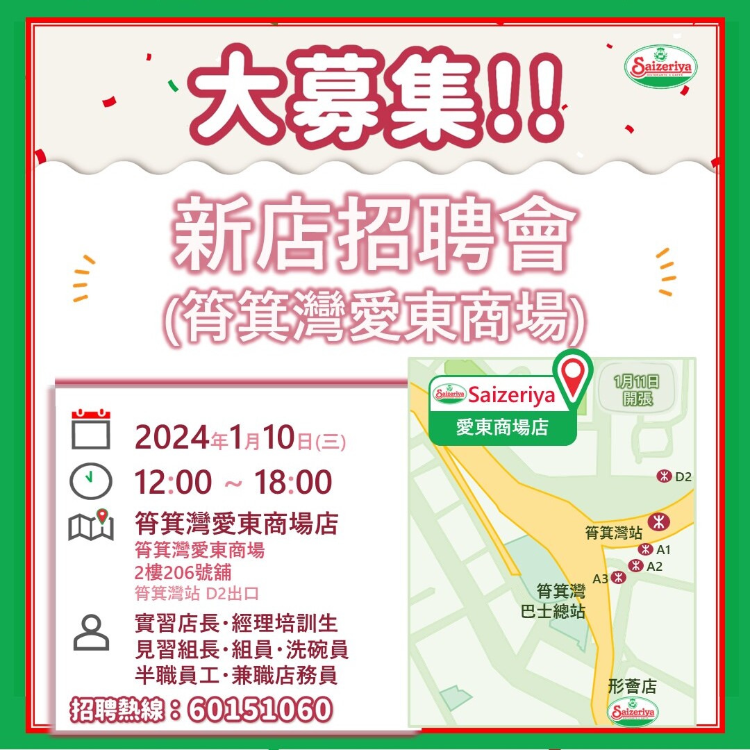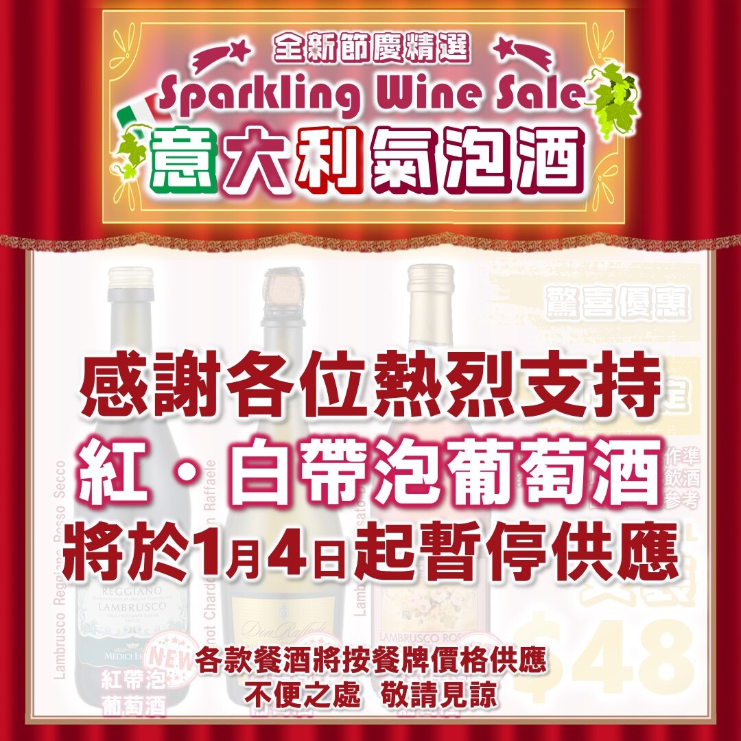 【意大利氣泡酒盛宴 】期間限定 – 即將結束(1月3日為最後一天)03/01/2024更多 【人才招募】新店招聘會(筲箕灣愛東商場)(1月10日)03/01/2024更多 【人才招募】南昌飲食業招聘會(1月5日)29/12/2023更多 【人才招募】新店招聘會(筲箕灣)(12月28日)21/12/2023更多 【期間限定 】意大利氣泡酒盛宴 (現正進行中)17/12/2023更多 【人才招募】南昌飲食業招聘會(12月22日)15/12/2023更多