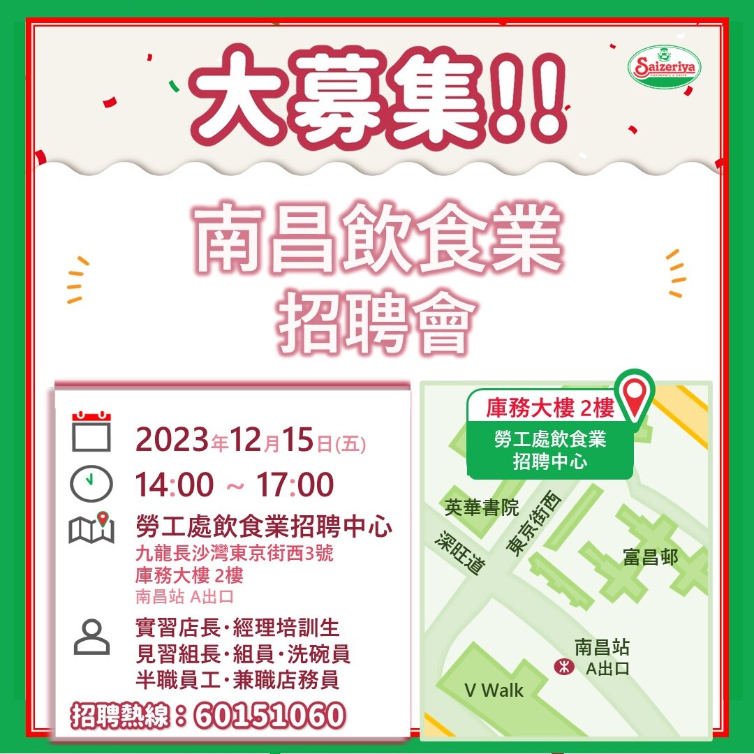 【人才招募】南昌飲食業招聘會(12月15日)08/12/2023更多 【人才招募】ERB招聘會(12月8日)01/12/2023更多 【人才招募】馬搜是尖@Recruit招聘進修展(12月7-8日)30/11/2023更多 【分店限定】明太子甜蝦多利亞 (11月27日起)29/11/2023更多 【分店限定】風乾火腿 (2片) (11月27日起)28/11/2023更多 【分店限定】意式清香洋蔥配溫泉蛋 – 擴展全店 (11月27日起)27/11/2023更多