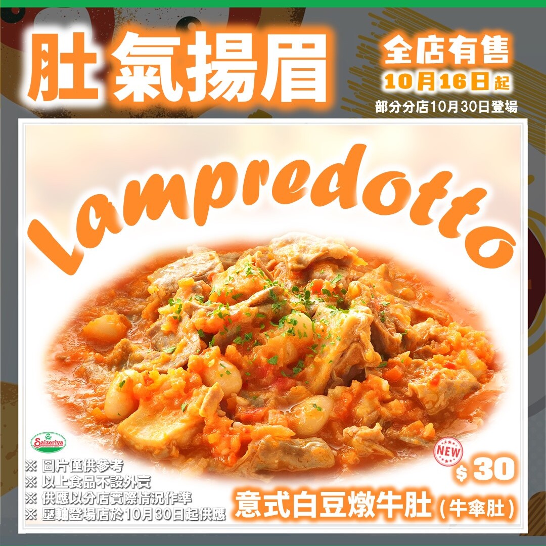 【分店限定】意式清香洋蔥配溫泉蛋(10月30日起)30/10/2023更多 【人才招募】招聘車 (黃大仙)(11月2日)26/10/2023更多 【人才招募】招聘車 (旺角)(10月27日)20/10/2023更多 【全店有售】意式白豆燉牛肚(牛傘肚) (10月16日起)19/10/2023更多 【新店】大埔大元商場店(現已開業)19/10/2023更多 【分店限定】風乾火腿 (10月16日起)18/10/2023更多