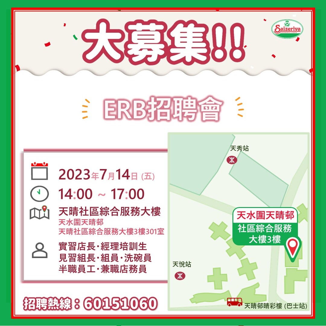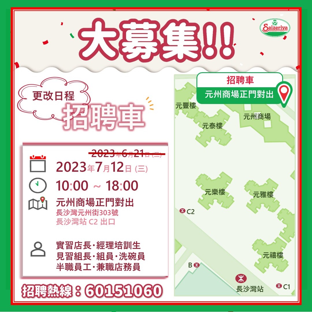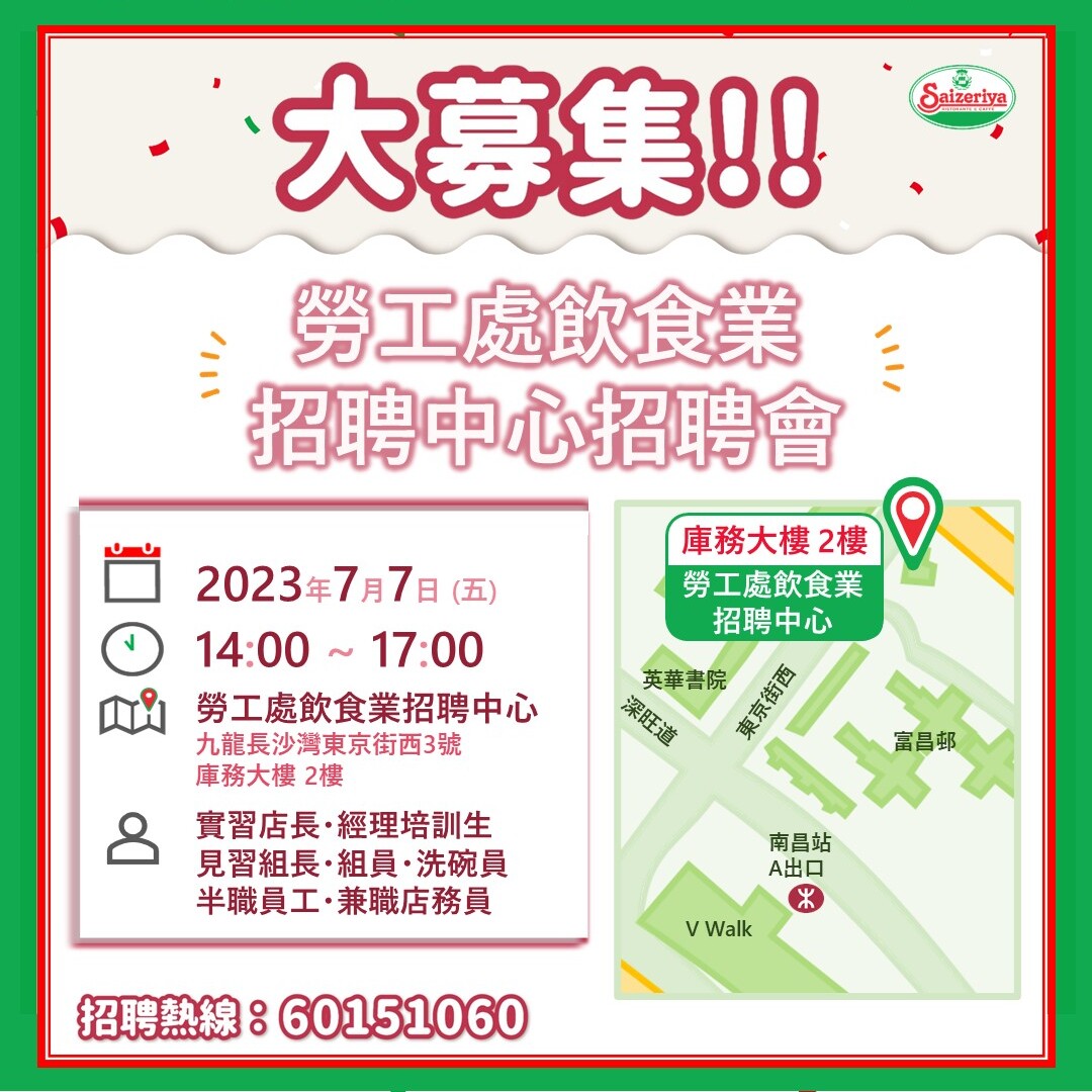 【人才招募】ERB招聘會(7月14日)07/07/2023更多 【人才招募】招聘車(7月12日)05/07/2023更多 【人才招募】南昌飲食業招聘中心招聘會(7月7日)30/06/2023更多 【隨時隨地ENJOY・如何烹調最美味 | Saizeriya薩莉亞】(3款冷凍食材全線登場)24/06/2023更多 【人才招募】明報「Jump教育及職業」博覽會(6月24日)17/06/2023更多 【新店】鑽石山鳳德商場店(現已開業)15/06/2023更多