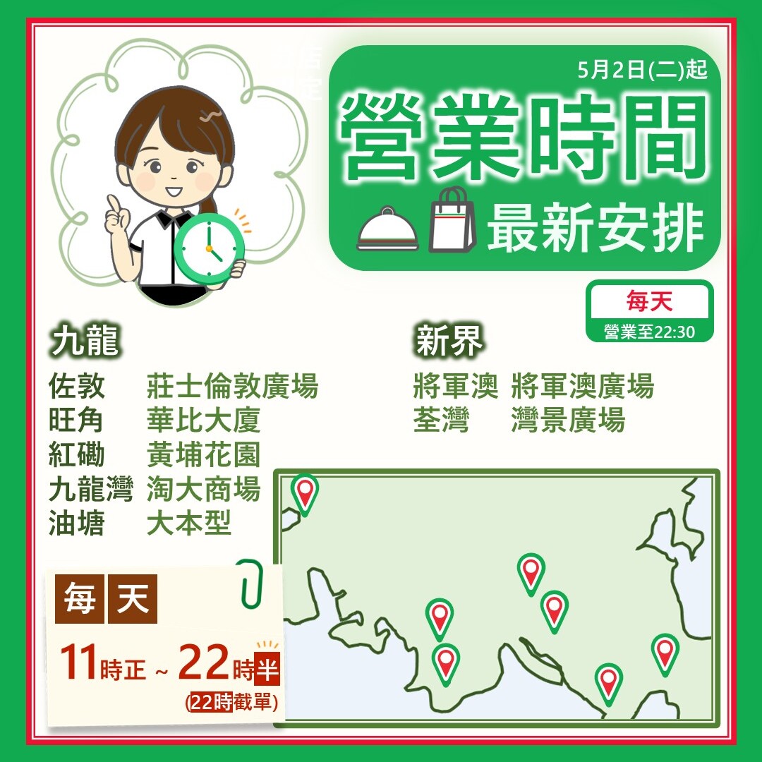 【人才招募】大型招聘會(5月23日)03/05/2023更多 【結業啓示】荃灣8咪半店(最終營業日5月14日)30/04/2023更多 【營業時間更新】 5月2日起28/04/2023更多 【2023Grand Menu】健康美味 – 香煎焗三文魚・白汁芝士焗三文魚26/04/2023更多 【分店限定・佛卡夏(原味意式麵包) 】(4月24日起)24/04/2023更多 【分店限定】羊鞍焗爐燒(2件)(4月17日起)19/04/2023更多